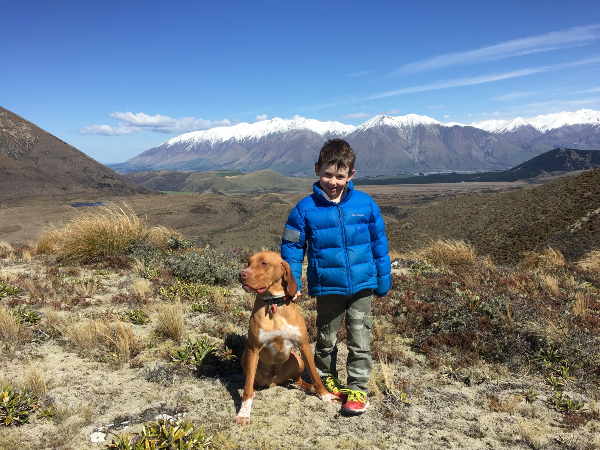 Once up the hill, (after some persistent cajoling!!) we were treated to some good vistas. The Big Ben Range was to our East, and then further to the South we could see the Rakaia River and the Mt Hutt Range. The seasons certainly have changed here and the temperature was very mild, almost warm if not for the sneaky breeze.